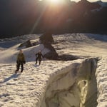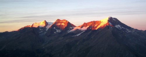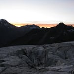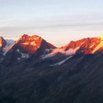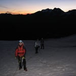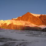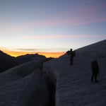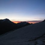 Nichtsdestotrotz stiegen wir diese Normalroute, welche mit PD- klassifiziert ist hoch (peu difficile). In südwestlicher Richtung überschritten wir den Feegletscher. Langsam wurde es hellrot am Horizont und die Sonnenstrahlen brachen über die Ostgipfel und wiesen uns den Weg.