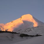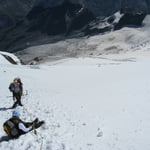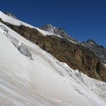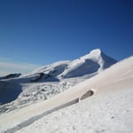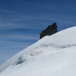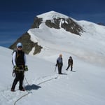 An der Felsinsel Pt. 3174 vorbei, teilweise etwas spannend durch Spaltenzonen, immer in ehrfurchtvollem Abstand unter der gewaltigen schrägen Felsmauer entlang. Von etwa 3600m stiegen wir direkt über die immer steiler werdenden Osthänge auf. Hier machte sich die Höhe bemerkbar und wir schlugen einige kürzere Verschnaufpausen ein. Bei 4000m erreichten wir das weitgespannte Gipfelplateau und gelangten um 11:15 Uhr auf den höchsten Punkt des Alphubels (4206m).