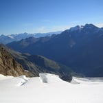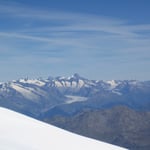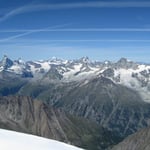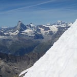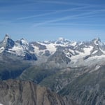 Was bot sich uns da für ein Panorama! Das Matterhorn lag direkt zu unseren Füssen, das Breithorn nebenan. Im Norden der Dom, im Süden das Allalinhorn und im Osten der Weissmies. Selbst der Mont Blanc und den Aletschgletscher konnte man sehr gut sehen.
