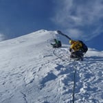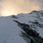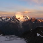 Nachdem wir einen wolkenfreien Sonnenaufgang geniessen konnten, blies der Wind von Westen nun immer mehr feuchte Luft und somit schlechteres Wetter zu uns hinüber. Kurz unter dem Vorgipfel des Doms ging die Sichtweite auf einen Meter zurück. Bei starkem Schneegestöber nahmen wir den letzten Gipfelanstieg auf 4545m vor. Wer diesen kennt, der weiss es: die letzten 100 Höhenmeter sind die härtesten!