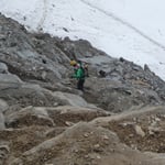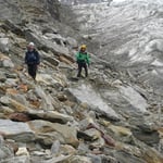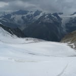Der Abstieg erfolgte über die Normalroute auf dem Hobärggletscher. Nach einer Stunde befanden wir uns wieder in der Sonne und konnten windfrei eine Pause einlegen. Danach ging es weiter zum Festijoch 3723 m, von wo wir uns zurück auf den Festigletscher abseilten. Nun stand noch der lange Abstieg über Eis und Schotter zurück zur Domhütte an. Erst jetzt sahen wir, was wir am Morgen alles geleistet hatten. Über Spalten, Moränen und Abbruchfelder ging es immer weiter hinunter. Beim Felssporn auf 3400 m zogen wir die Steigeisen und Klettersachen aus. Es folgte der Restabstieg zur Domhütte, welche wir um 12:30 Uhr wieder erreichten.