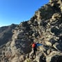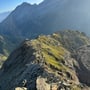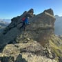 Nach einer kurzen Trinkpause, mit dem Pickel in der Hand und dem Helm auf dem Kopf, ging es um 06:50 Uhr weiter auf dem schier endlosen Breitloibgrat. Es folgte eine anregende Kraxelei, die meist auf der Krete erfolgte. Die grösseren Gendarme konnten links oder rechts umgangen oder auch überklettert werden; so wie es einem beliebte. Die Kletterschwierigkeit ging während der ganzen Tour nie über eine III hinaus.