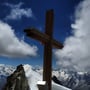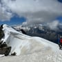 Unterhalb des Firnfeldes bei Pt. 3927 montierten wir die Steigeisen und stiegen hoch zur Wechte, durch welche bereits eine gut ausgebaute Spur führte. Wir entschlossen uns jedoch etwas weniger Steil südwärts hoch zum Pt. 3919 zu steigen. Von hier verlief der Weg dann auf der Krete bis zum Gipfelkreuz des Fletschhorns (13:10 Uhr).