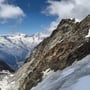 Eine längere Rast gönnten wir uns am panoramareichen Gipfel nicht. Wir wollten möglichst schnell einige Höhenmeter runter, um uns dann zu entscheiden, welche Abstiegsroute wir wählen würden. In einem nördlichen Bogen stiegen wir den Grüebugletscher hinunter mit der Absicht, einen Weg zwischen der Lücke von Pt. 3538 im Westen und dem Pt. 3914 im Osten zu finden. Da waren zwar in der Ferne Spuren zu sehen, doch vor uns befand sich nur wilder, sehr stark zerklüfteter Gletscher.