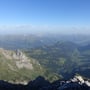 Als wir kurz vor 07:00 Uhr den Grat erreichten, wurden wir von der aufgehenden Sonne begrüsst. Die ganze Umgebung erschien in zarten gelborangenen Farben und es kündigte sich wiederum ein hochsommerlicher Tag an.