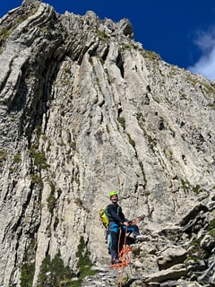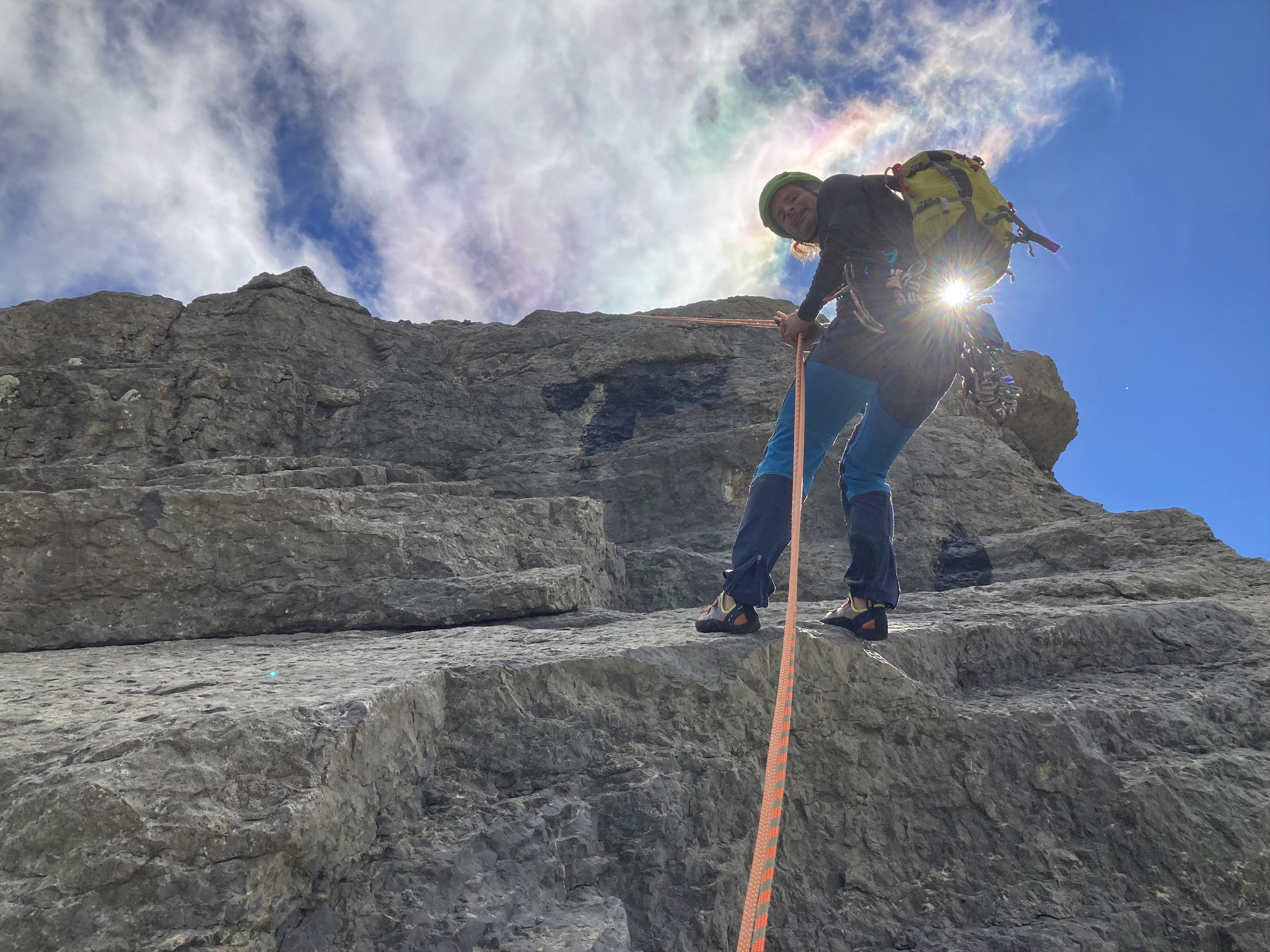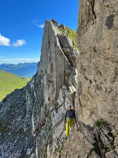 Der Abstieg ist nochmals ein kleines Abenteuer für sich. Erst gilt es 15 Meter über eine Platte abzuseilen (kann auch abgeklettert werden), dann folgen 20 Meter Abseilstrecke auf den Grat, welcher anschliessend relativ steil abfallend, heruntergeklettert werden muss. Am besten man macht dies am kurzen Seil.