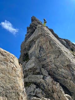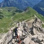Die letzten drei Seillängen waren nochmals genussvoll. Kurz vor dem Gipfel wartet dann noch ein schmaler Grat, der entweder am kurzen oder so wie wir das gemacht haben, laufend am langen Seil überquert werden kann. Zacken und Risse für die Anbringung von Selbstsicherungen sind genügend vorhanden.