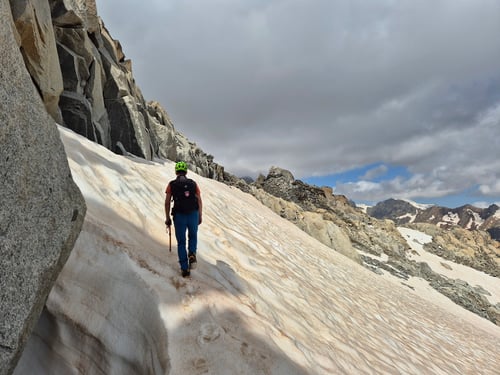 Der Aufstieg in Richtung Hauptgipfel über das Firnfeld war schweisstreibend. Wir entdeckten noch eine weitere improvisierte Abseilstelle, wo anscheinend andere Tourengänger mehrere Schlingen aneinanderreihten, um so über den Felsabbruch den Firn zu erreichen.