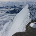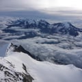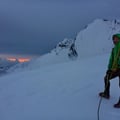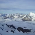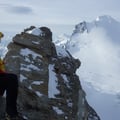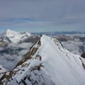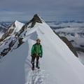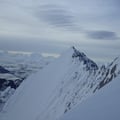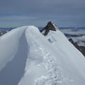 Zügig schritten wir auf dem Nordostgrat dem Gipfel entgegen. Im oberen Teil galt es noch ein paar Felsaufschwünge, welche bereits deutlich durch Kratzer der Steigeisen der vielen Tourengeher gekennzeichnet waren, zu überwinden. Dann erreichten wir das begehrte Gipfelkreuz auf 4327m und konnten die Aussicht sogar für einige Zeit für uns ganz alleine geniessen.
