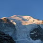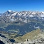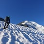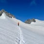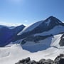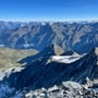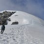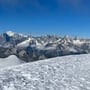 Mit einer Steilheit von 45° und hartem Firn waren die Steigeisen obligatorisch. Schon nach kurzer Zeit erreichten wir den flachen Schneegipfel und erfreuten uns an der tollen Aussicht, vor allem auch ins Gebiet des Mont Blanc.
