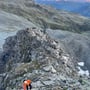 Wir wählten jedoch in Unkenntnis des Weiterwegs die untere Alternative und mussten etwas heikel und ausgesetzt bis zu einem kleinen Couloir traversieren, von wo wir wieder den Grat erreichten. Weiter geht es im Blockgelände bis zum Beginn des schönen Firngrats unterhalb des Gipfels.