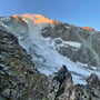 Wir hatten den Wecker auf 5:00 Uhr gestellt, um pünktlich zum Sonnenaufgang gegen 7:00 Uhr am Grat zu sein. Dazu geht man über die diversen Schuttfelder und Moränen unterhalb des Glacier du Petit Combin in Richtung Pt 2'765 und wechselten auf die Ostseite des Grates, wo man etwas unterhalb die ersten zwei Türme traversierten, um bei einem Grascouloir in morschem und moosigem Fels die Gratschneide zu erklimmen.