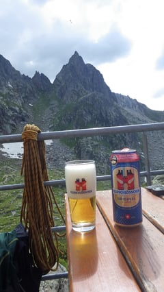 Natürlich kehrten wir nicht zu spät zur Hütte zurück, sodass wir noch vor dem Essen ein paar Bierchen in der Sonne geniessen konnten. Zum Abendessen gab es eine leckere Suppe und Risotto mit Rindfleisch. Jedoch kein Dessert! So was hatten wir beide noch nie erlebt. Was Süsses zum Dessert wäre toll gewesen. Doch dafür standen auf den Tischen freies Mineralwasser und Brot. Und, jeder Gast bekam eine Stoffservierte. Auch sowas hatten wir beide noch nie auf einer Hütte erlebt :-)