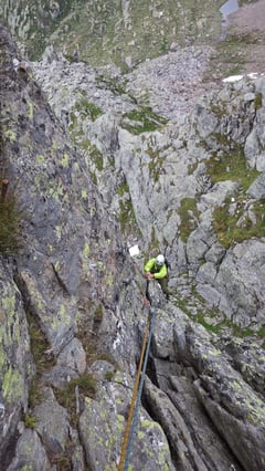 Als das Kraxeln zu ausgesetzt wurde, seilten wir uns an und kletterten die III und IV Stellen bis zum Gipfel. Schneller als gewünscht kamen wir dort an, doch der Abstieg mit den fünf Abseilstellen war genauso interessant wie der Aufstieg. Nach einer kurzen Rast nahmen wir diese in Angriff.
