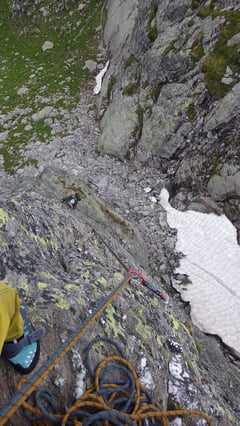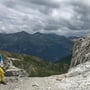 Der Einstieg zur Spigolo NE war schnell gefunden. Der Fels jedoch kalt und zudem ging ein bissiger Wind. Als wir schliesslich loskletterten war ringsum noch immer alles wolkenverhangen. Zum Glück hatten wir unsere Windjacken dabei!