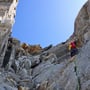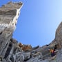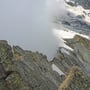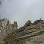 Obwohl sich beim Einstieg gelbe Pfeile befanden, irrte ich unnütz in der ersten Seillänge umher. Aber zum Ärgern war keine Zeit. Bald fand ich die spärlich vorhandenen Bohrhacken und wir gelangten bei Port auf 3'200m auf den Grat. Das Port, also Türe oder Pforte, eröffnete uns dann auch die Aussicht auf den schier endlosen Kamm, der vor uns lag und den es zu überqueren galt.