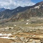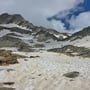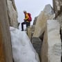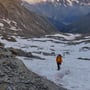 Der Weg in Richtung Sonnigpass, war von der Hütte aus sehr gut markiert und auch nachts (um 04:00 Uhr ging es los) einfach zu finden. Auch der Abzweiger in Richtung Port, wo sich ein grosser gelber Pfeil befindet und den Weg zur Einstiegsverschneidung weist, fanden wir problemlos. Auch existiert der Rotblattgletscher (leider) nicht mehr und wir konnten einfach das Firnfeld bis zum Felsfuss hinaufsteigen (2h von der Hütte).