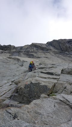 Es zeigte sich als Vorteil, dass wir unser Set an Friends und Keilen dabei hatten. Aufgrund (für uns) undokumentierten Routen, welche unsere kreuzte, war es nicht immer einfach den richtigen Weg zu finden. Gerade in der dritten Seillänge, welche im Schwierigkeitsgrad 5c zu bezwingen war, kam ich im Anschluss in die 3. Seillänge der Via Esther und legte fluchend nach der 5c auch noch die 5b hintenan. Die Seilreibung war unbeschreiblich und ich kam kaum hoch zum Stand.