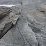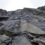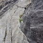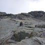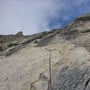 Schon von Weitem erkannten wir, dass einige Stellen der Platten noch feucht waren und glänzten, doch wir hofften dennoch einen Weg durch die Nässe zu finden. Nach dem montieren der Kletterschuhe und errichten eines Depots (wir hatten vor, uns wieder über die Route abzuseilen), starteten wir in die Route "Il tempo vola", welche aus 13 Seillängen bestand und wo man den 5. Schwierigkeitsgrad (5b obl.) beherrschen musste.