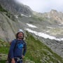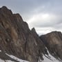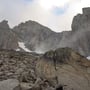 Am Ende der Moräne montierten wir unsere weislich mitgenommenen Steigeisen. Ohne Zackenschuhe und Pickel wäre das Schneefeld zum Einstieg in die Routen der Ostwand schwierig gewesen. Ich schätzte die Steilheit auf rund 40 Grad.
