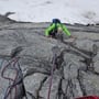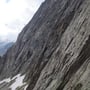 Die erste Seillänge folgte entlang einem Schneefeld. Wir erreichten die Abzweigung zur Route Goldrausch und stiegen sogleich in die 3. Seillänge ein. Die 4c war aufgrund von feuchten Stellen bereits eine Herausforderung. Doch mit ein wenig fluchen noch zu meistern.