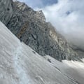 Wir schritten also in einem schnelleren Tempo voran und erreichten bald die Querung im Firn zum Couloir. Hier überraschte uns ein regelrechter Klettersteig, der steil hinauf in das Couloir führte. Früher war der Einstieg direkt möglich, heute muss man zuerst etwa 40m auf Eisentritten hochsteigen.