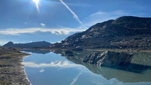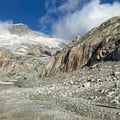 Weiter dem Tiefenbach folgend, boten sich uns schockierende Bilder. Dort wo vor 10 Jahren noch fester Gletscher war, tummeln sich Flüsschen und Seen. Der Gletscher ist aufgrund der Erderwärmung derart zurückgegangen, dass sich das Landschaftsbild komplett änderte. Markierungen mit Jahresangaben weisen auf den Gletscherschwund hin, der ungebremst weitergeht.