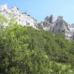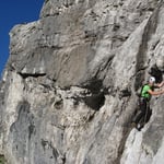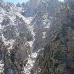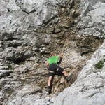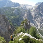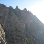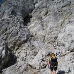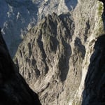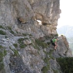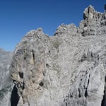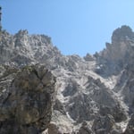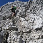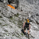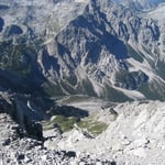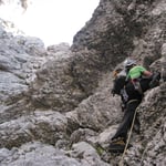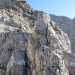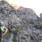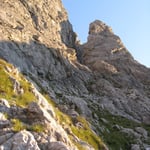 Das Thema Steinschlag, welches man immer wieder im Zusammenhang mit der Ostwand hört, kann in der Tat nicht verleugnet werden. Zwei Seilschaften in der Münchner Route wären nicht denkbar. Es ist unmöglich auf den schmalen Grasbändern und Platten zu Gehen, ohne dass sich Steine lösen. Man muss also unbedingt mit aufmerksamen Augen und Ohren klettern. Da wir die vorderste bzw. die oberste Seilschaft waren, hatten wir das Steinschlagproblem nicht. Und wir wollten auch, dass dies so bleibt. Nach einer Rast in der Gipfelschlucht, machten wir uns sogleich auf zur Biwakschachtel, dem Ziel der nächsten Etappe.
