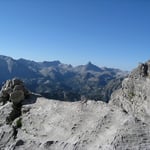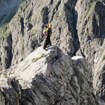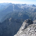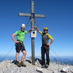 Auf dem Bänkli des Bergführers Heinz Zembsch genannt Ostwandkönig (er hat die Wand über 300 Mal durchstiegen) war die letzte Trinkpause. Dann folgte der Schlussspurt durch einen der Gipfelkamine. Über die 4er Stelle, welche ich natürlich rotpunkt kletterte, erreichten wir schliesslich nach 6 Stunden um 09:45 Uhr die 2714 Meter hohe Watzmannsüdspitze. Über die gute Zeit freute ich mich zusätzlich. Korbi meinte, er hätte den Münchner Weg noch nie mit einem Gast in 6 Stunden geschafft. Wir legten also mit Pausen pro Stunde 350 Höhenmeter zurück.