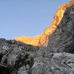 Die ersten paar 100 Höhenmeter gingen wir seilfrei. Meist war Blockkletterei gefragt, ab und zu mussten wir ein paar Platten traversieren. Beim grossen Schotterfeld legten wir um 05:45 Uhr die erste Pause ein. Hier konnten wir auch den Wasservorrat mit Schmelzwasser auffüllen. Nach einem kleinen Snack ging es weiter. Es folgte die Abzweigung auf den Münchner Weg; bei der Gipfelschlucht würde dieser wieder mit dem Berchtesgadener Weg zusammenkommen. Meine Entscheidung, die Route des Münchner Weges zu nehmen, erwies sich als richtige Wahl! Die folgende Kletterei war grandios und entsprach meinem Niveau. Es war also ein richtiger Genuss für mich :-)