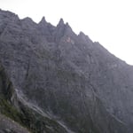 Start um 03:45 Uhr. Den Wanderweg zur Eiskapelle brachten wir in einer halben Stunde anstelle der ausgeschriebenen 1,5 Stunden hinter uns. Das Tempo war entsprechend hoch. Es war noch stockdunkel und beängstigend still. Unsere Stirnlampen bahnten einen Weg durch die Nacht. Die Wand konnte man noch nicht erkennen. Die „Anlegestelle“, also der Ort wo man den Klettergurt anzieht und das Seil bereitmacht, erreichten wir nach einem steilen Anstieg über Grasbänder. Erst jetzt brach langsam die Morgendämmerung ein.