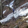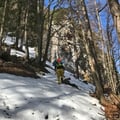 Als wir den Sattel schliesslich erreichten und einen ersten Blick auf die Südseite des Rotofen erhaschen konnten, war klar, dass die Bedingungen gut waren. Die warme Sonne der letzten Tage hatte den Schnee weggeschmolzen und die südlich ausgerichteten Wände und Rinnen waren schneefrei.