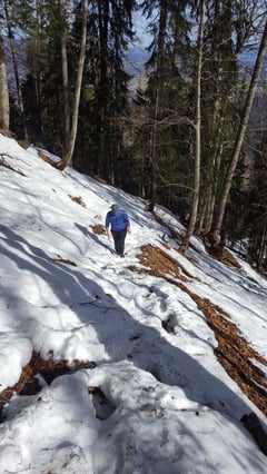 Um halb neun Uhr starteten wir vom Wanderparkplatz bei Hallthurmmoos, welcher auch als Hexenparkplatz bekannt ist. Langsam stiegen wir auf dem Wanderweg Nr. 469 dem Rotofensattel entgegen. Auf den letzten hundert Höhenmetern galt es die ersten Stapfen in den Schnee zu treten. Anscheinend war seit dem letzten Schneefall niemand mehr hier entlang gegangen.