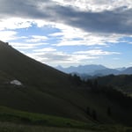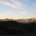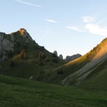 Nach unzähligen Kurven auf den Schotterpisten erreichten wir schliesslich die Alp. Rechtzeitig, um die letzten Sonnenstrahlen zu geniessen und anschliessend, die im Sonnenmeer untergehenden Bergspitzen, vom Campingstuhl aus zu beobachten.