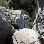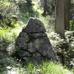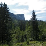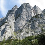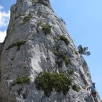 Durch den steilen Wald gelangt man schliesslich an den Wandfuss der Steinplatte und folgt rechts am Wandfuss entlang den Steigspuren zum markanten Einstieg - dieser befindet sich in einem kleinen Sattel, der durch einen markanten vorgelagerten Felsturm schon von weiter weg gut zu erkennen ist.