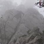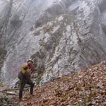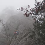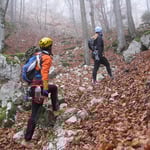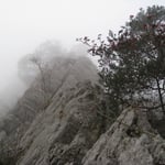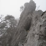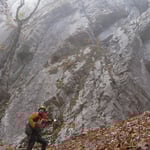 Die Kletterfinken wurden durch Turnschuhe gewechselt, dass Seil aufgenommen, ein Schluck kaltes Wasser getrunken und weiter ging es. Der Nebel zog auf, es wurde schnell finster. Schon nach wenigen Metern verloren wir auf einer Wiese den Trampelpfad und schlugen uns durch die Büsche. Taschenlampe hatten wir keine dabei – wir wollten ja nur schnell….