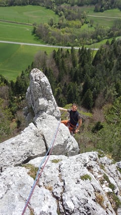 Nach einem zehnminütigen Fussmarsch standen wir bereits an den Felsen der Bonnes Fontaines, wo wir uns für die Mehrseillängenroute La Nostalgique (5c) entschieden. Die aus fünf Seillängen (5b+, 5c, 5a+, 5b+, 5b+) bestehende Route war ein Klassiker schlechthin und sehr typisch für die Jurakletterei. Ein purer Genuss, welcher einer Wiederholung würdig ist.