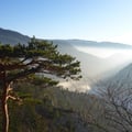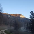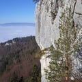 Als wir in Richtung Delémont fuhren klebte ein dicker Januarnebel über der Landschaft. Obwohl sich obendrüber kein Wölkchen befand, herrschte ein kaltes, eisiges Klima. Als wir hinauf nach La Bergerie fuhren klarte der Neben mit dem diffusen Licht nur sehr langsam auf. Erst als wir den Parkplatz hinter dem kleinen Tunnel erreichten, konnten wir den blauen Himmel sehen. Was für ein Glück, die Felsrippe lag just einige Meter oberhalb der Nebelgrenze.
