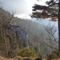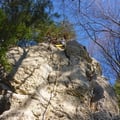 Die Seillängen (5c, 5c+, 5c, 5a) sind relativ lange. Bei der dritten Seillänge erstellten wir sogar einen Zwischenstand (beim einbetonierten Muniring an der Tanne rechts). Somit kletterten wir insgesamt fünf Seillängen.