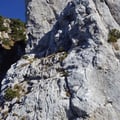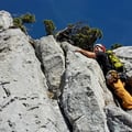 Die schöne, abwechslungsreiche Kammkletterei wurde gegen Routenende immer einfacher. Nach dem Ausstieg (Routenbuch) führte der Weg weiter durch dichte Kieferngewächse, ehe wir auf einem ausgesetzten Trampelpfad auf Grasbüscheln zur nordseitigen Abseilstelle gelangten.