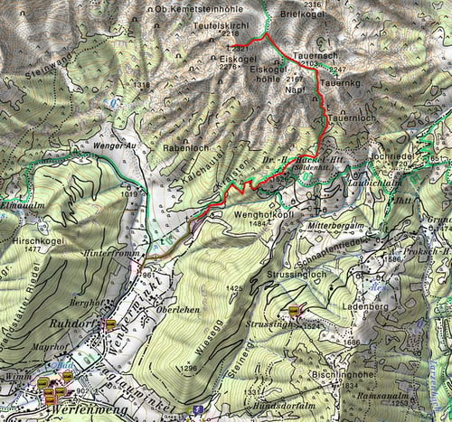 Vom Parkplatz bei Wengerwinkl über Wiesen nordostwärts bis in den obersten freien Bereich, wo man auf den breiten, teilweise steilen Sommerweg trifft, den man zunächst durch Buschwerk, dann durch Hochwald bis zur Waldgrenze verfolgt; etwas oberhalb auf einem Rücken nach links zur Hachelhütte. Von dort den S-Hang - immer etwas aufsteigend; über einen Graben hinweg - queren, bis man auf die schönen Hänge unterhalb des Tauernkogels trifft; über sie aufwärts, über eine felsige Steilstufe von rechts nach links querend und im oberen Kar weiter in die Tauernscharte, 2103m. Jenseits der Scharte kurz abwärts und über flach-welliges Gelände nach Nordwesten, bis man über die Gipfelhänge des Eiskogels nach links (südwestwärts) zum Gipfel aufsteigen kann.
