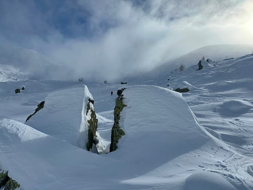 Erst auf einer Höhe von 2'500 Meter war die Sicht wieder akzeptabler. Da das Gelände jedoch schwer zu lesen war und aus lauter Mulden, Hügeln und Geröllfeldern bestand, mussten wir immer wieder das Navi konsultieren, um auf der richtigen Abfahrtsroute zu bleiben.