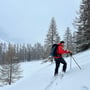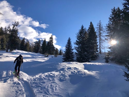 Zurück auf den Tourenskiern, mussten wir schon bald wieder einen Stopp einlegen. Denn die Sonne wärmte uns ganz schön und beim Aufsteigen kamen wir ins Schwitzen. Mit der Windjacke im Rucksack ging es dann weiter im Zick-Zack in Richtung Galestafel.