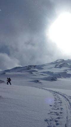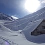 Die Abfahrt hinunter zu Hütte war anfangs steil und kurz. Die Sonne drückte gerade noch ein paar Strahlen durch die zunehmende Wolkendecke und bescherte uns eine freudige Abfahrt.