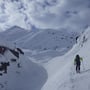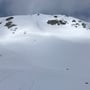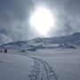 So mussten wir einmal mehr Anfellen und einige Höhenmeter aufsteigen. Hier fanden wir dann auch die Fülle der erwarteten Spuren im Schnee des sehr häufig begangenen Skitourenberges. Von nun an konnten wir uns nicht mehr verirren. Die Abfahrt über den Bergkamm "Im Laub" war Genuss, wenn auch schon sehr verfahren.