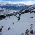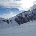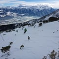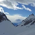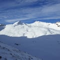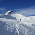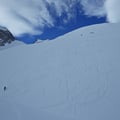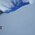 Die Fahrt hinunter ins „Loch“ war traumhaft. Etwa 15 cm vom Wind verblasener Schnee lies ein Fahrvergnügen wie bei Neuschneeverhältnissen zu! Spuren existierten noch fast keine und überhaupt gab es mehr als genügend Platz seine eigene Linie in den Hang zu zeichnen.