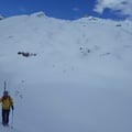 Wir entschlossen uns ca. 200 Höhenmeter mit den Fellen nach Isisizess (1863m) abzufahren um dann über die Punkte 1976 und die Alt Alp (2148m) zum Isisizer Rosswis hochzusteigen. Diese Routenwahl bedeutete einen kleinen Umweg; uns beiden schien jedoch der konstante leichte Aufstieg in der Sonne die bessere Wahl.