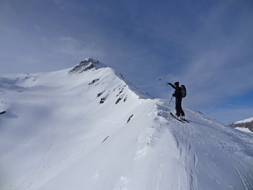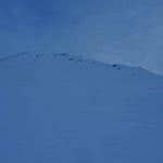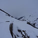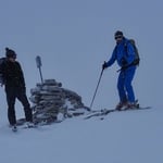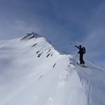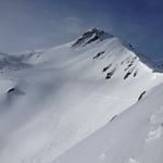 Trotz einer kalten Biese schritten wir bei Prachtsverhältnissen voran. Bereits nach 1,75 Stunden standen wir auf dem 2740 Meter hohen Pazolastock. Eisiger Wind und zunehmend schlechteres Wetter, welches von Süden zu uns rüber drückte, luden nicht lange zum Verweilen ein. Vor uns lag eine sensationelle Abfahrt über den Osthang hinunter zum Zustiegsweg der Maighelshütte.