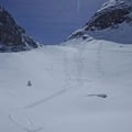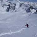 Vor uns wartete eine sensationelle Abfahrt bei absolut besten Schneeverhältnissen. Es war als ob wir knietief in einem Wattenmeer die Hänge runterfuhren. Trotzdem wir teilweise bis zu den Oberschenkeln in den Kurven eintauchen konnten, war jede Bewegung leicht und ohne Wiederstand. Ein absoluter Traum.