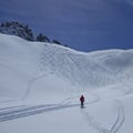Doch die Anstrengung der Tour bestand heute nicht im 1'220 Höhenmeter Aufstieg, sondern bei der Runterfahrt. Denn das gestrige, sonnige und warme Wetter hatte die komplette Schneeoberschicht aufgetaut und war über Nacht zu einer brüchigen Schneeeisdecke gefroren.